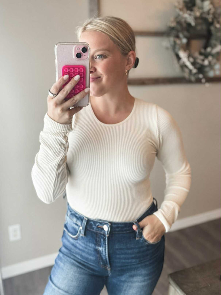 Fit Guide: The ultimate closet staple, this ribbed bodysuit is made with soft, stretchy fabric that hugs in all the right places. Featuring a round neckline, long sleeves, and a fitted silhouette, it’s perfect for layering or wearing solo. Designed with a thong back and snap button closure for a smooth, seamless fit, this bodysuit runs true to size for a sleek, polished look. Available in Black, Cream, and Sand.