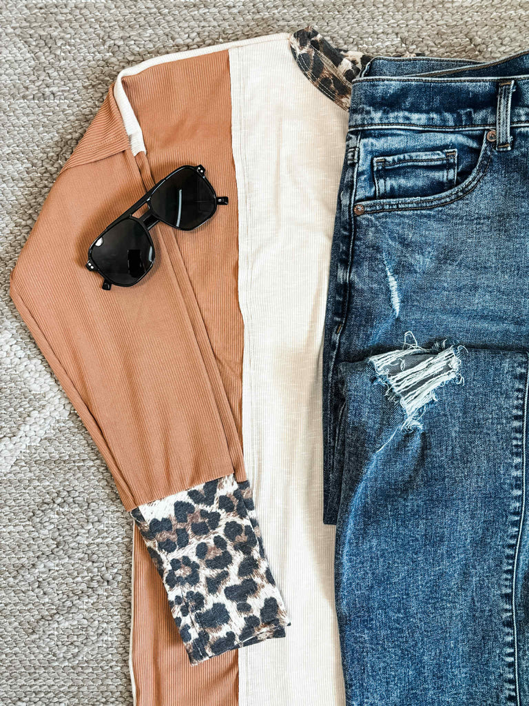 Cutest Top // Color Blocking // Leopard Detail // Ribbed Material // Soft and Stretchy // Dress Up Or Down // V Neck Detail // Exposed Seams // Fall Favorite