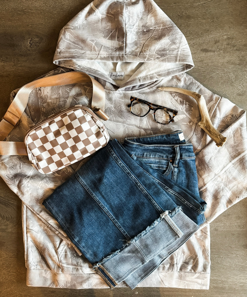 Fit Guide: The Camo Hoodie is an everyday essential for casual comfort! Made from lightweight, Dri-Fit feel fabric, it features a hood, kangaroo pocket, and classic camo print. True to size with a relaxed, comfortable fit, it’s perfect for layering or wearing alone for effortless style and cozy vibes.