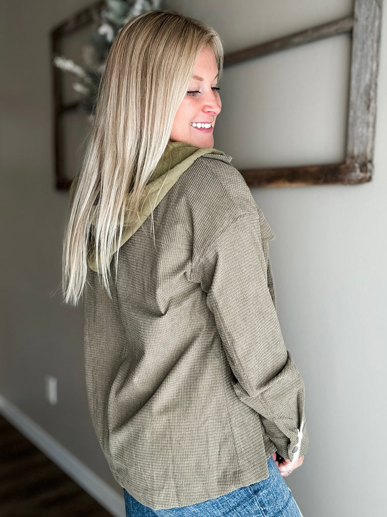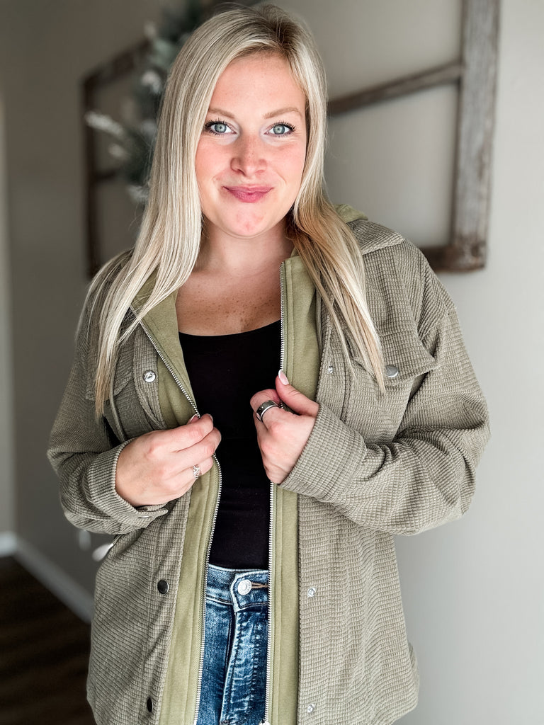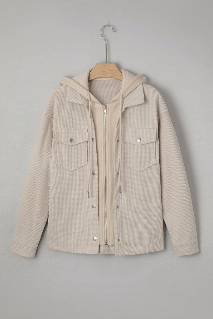 Fit Guide: The 2-in-1 Jacket runs true to size with a structured yet comfortable fit that’s perfect for layering through the cooler months. The double lining, hoodie, and drawstring details add both function and style, while the thick material keeps you warm without feeling bulky. With a zipper and button closure plus front pockets, it’s an easy go-to for everyday wear. Recommended to stick with your true size!