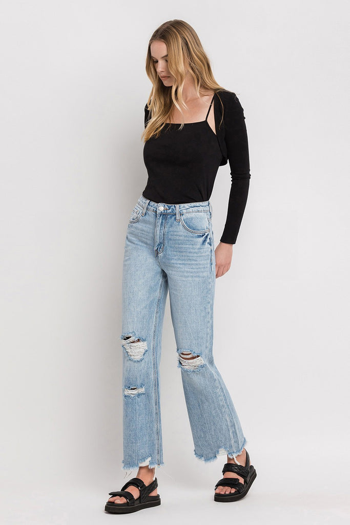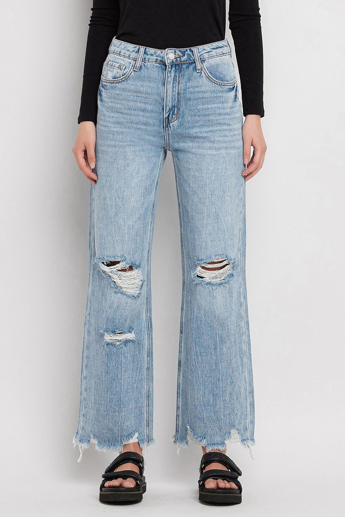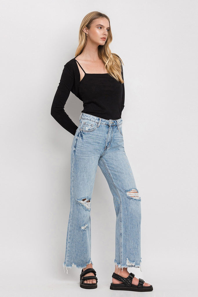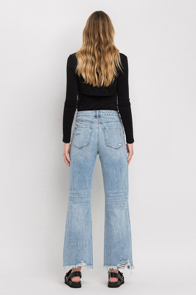 Non-Stretch Denim // Super High Rise Waist // 90’s Vintage Style // 5 Pockets // Distressed Details // Flare Leg