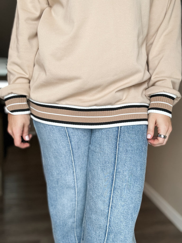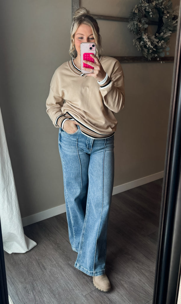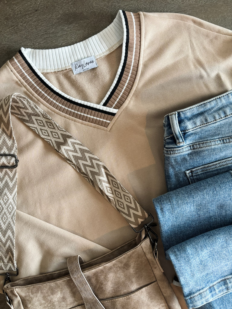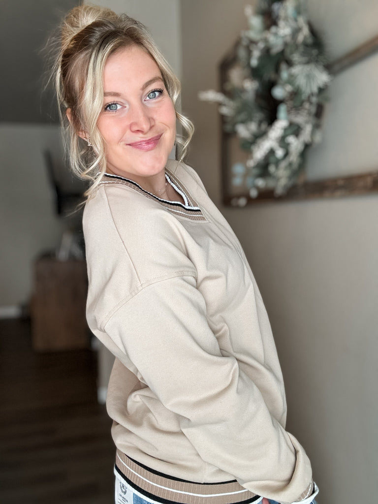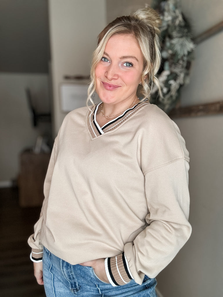 Pullover // Extremely Comfortable // Wear Casual Or Dress It Up // Simple Style // Ribbed And Striped Accents on Hems, Cuffs, and Neckline // V Neck