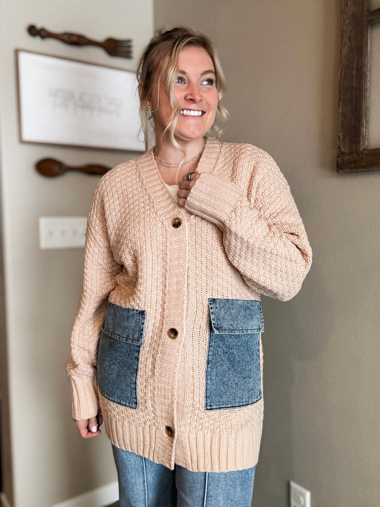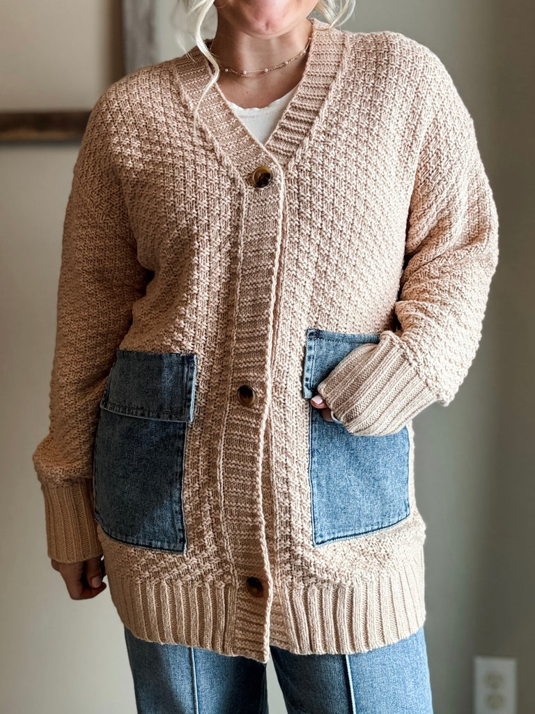 Knit Cardigan // Denim Patch Details // Button Up Design // Comfy And Cozy // Pair With Leggings Or Jeans // Elevated Look // RayLarae Branded