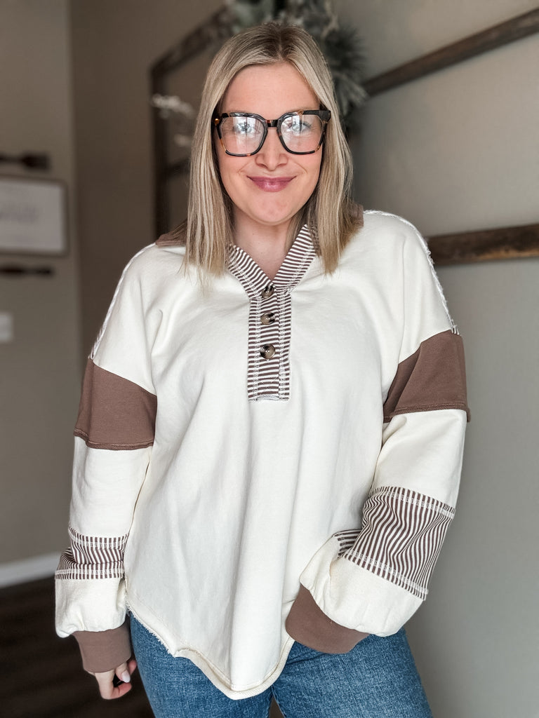 Fit Guide: Talk about a trendy piece — this top has everything you need. From the button details and stripes to the colorblock design, it makes a statement while still being easy to wear. The fit is relaxed and roomy but still true to size, giving you that effortless look without feeling oversized. The fabric is soft and cozy, and the v-neck with collar keeps it flattering whether you dress it up or keep it casual. Stick with your usual size for a relaxed fit, or size down if you’re between sizes or prefer a more fitted look.