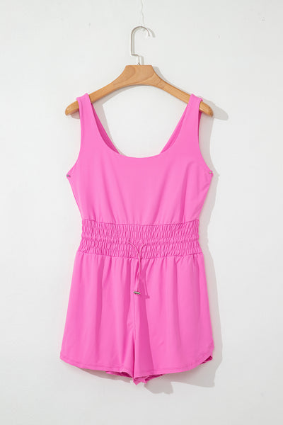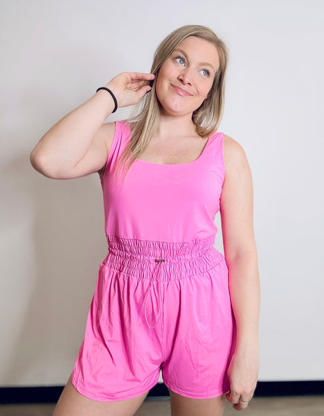 Fit Guide: This adorable romper is truly the cutest and comfiest one to exist—designed for both movement and lounging, it's your new favorite throw-on-and-go piece. Made from buttery soft athletic material, it features a relaxed tank top style, a thick cinched waistband, and a drawstring elastic waist for the perfect fit. Built-in shorts underneath and functional pockets make it as practical as it is cute.