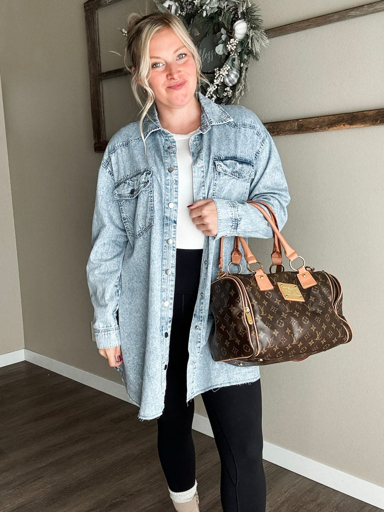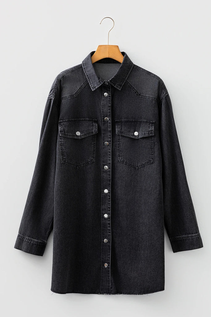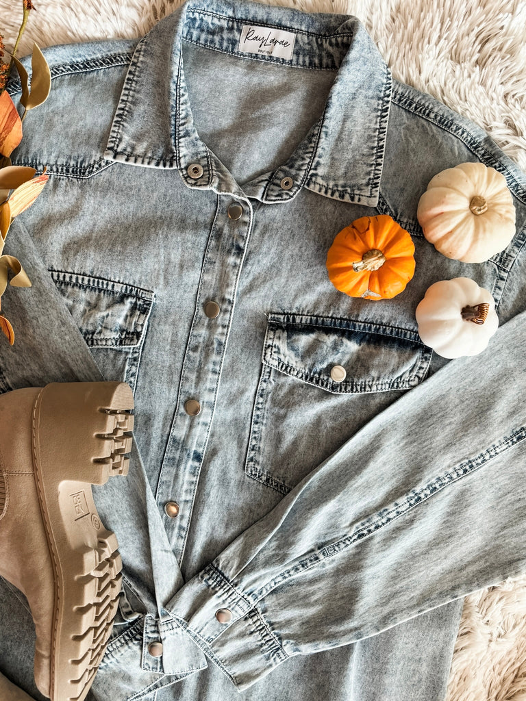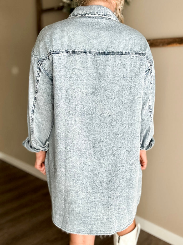 Fit Guide: This denim shirt dress features a true-to-size fit with a lightweight, comfortable feel—perfect for layering or wearing on its own. The 100% cotton fabric gives it a relaxed structure, while the frayed edges and front pockets add a casual, laid-back touch. Stick with your usual size for an easy, effortless fit that moves with you. A timeless fall staple that’s as versatile as it is stylish.