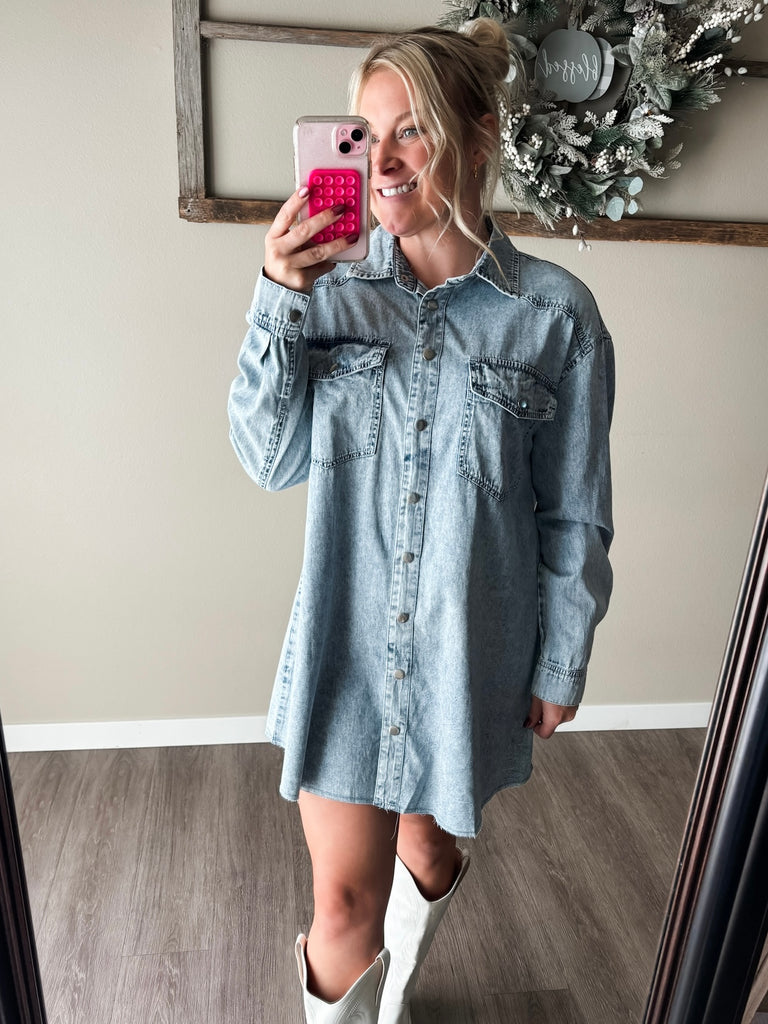 Denim Dress // Frayed Edges // Collar // Front Pockets // Buttons // Lightweight // Comfortable // Layering Dress // Fall Staple