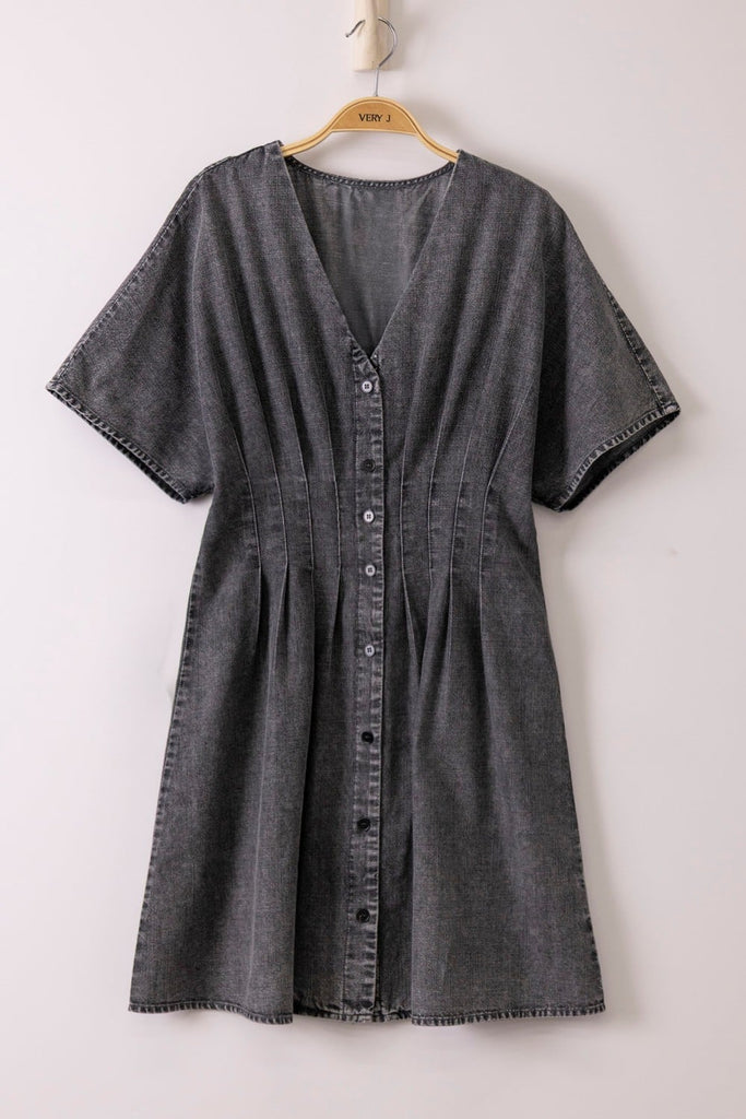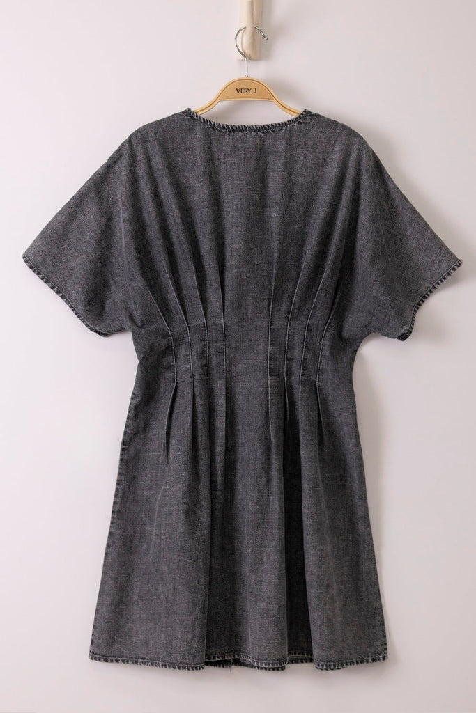 Mini Dress // Chambray // Mineral Wash // Pintuck Detail // V Neckline // Short Sleeves // Button Down Front // Perfect For Spring & Summer