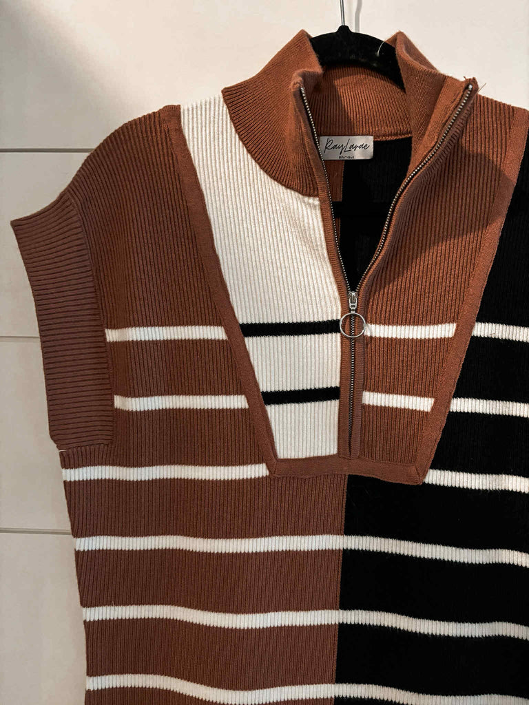 Short-Sleeve Sweater Dress // Color Blocking // Chic and Sporty Vibe // Ribbed Material // Half-Zip Mock Neck // Ring Pull Zipper // Flattering Silhouette // Cap Sleeves