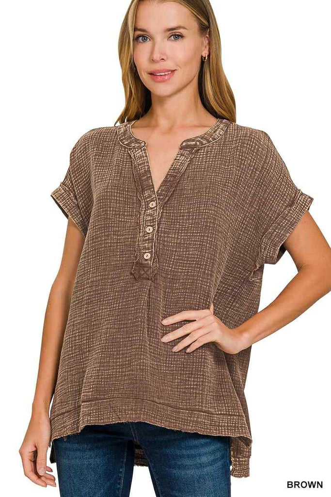 Basic Fade V-Neck Acid Wash Top - Brown - SIZE S/M
