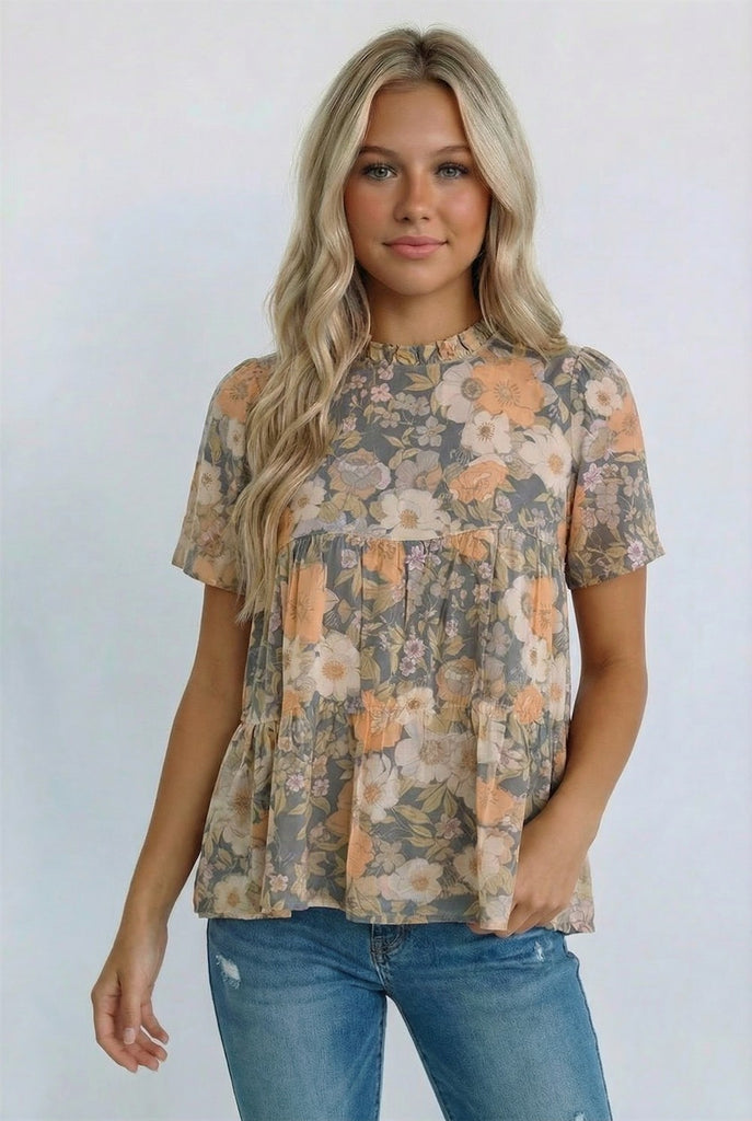Ruffled Mock Neck // Short Sleeves // Babydoll Silhouette // Tiered // Floral Print // Crinkle Woven Fabric