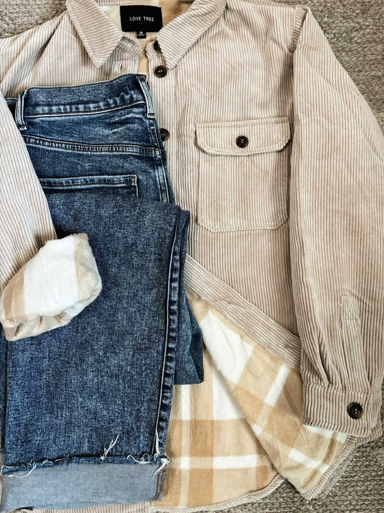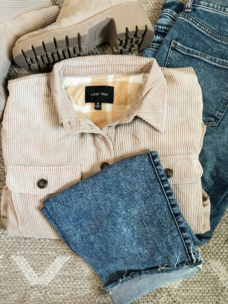 Fit Guide: This Love Tree Corduroy Shacket is the perfect cozy crossover between a shirt and a jacket—your new go-to layering piece! Featuring a soft, checkered flannel interior and a relaxed corduroy exterior, it provides warmth without the bulk. Functional front and side pockets add practicality, while the relaxed fit makes it easy to layer over tees, sweaters, or hoodies. True to size with plenty of room for layering, this shacket is a must-have from fall through spring. Grab your usual size for an effortlessly laid-back and cozy look.