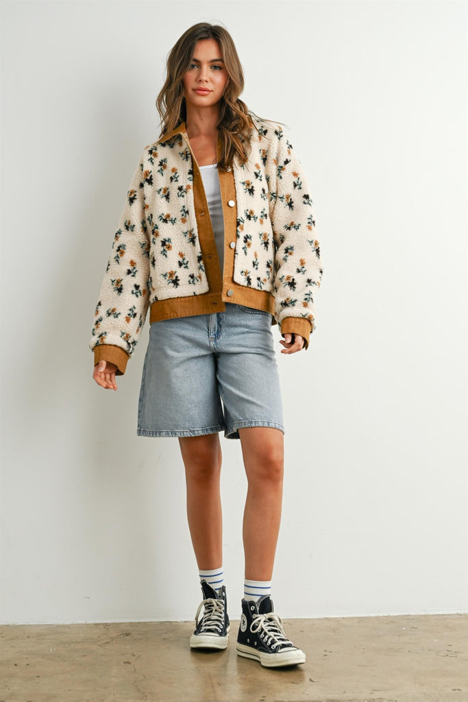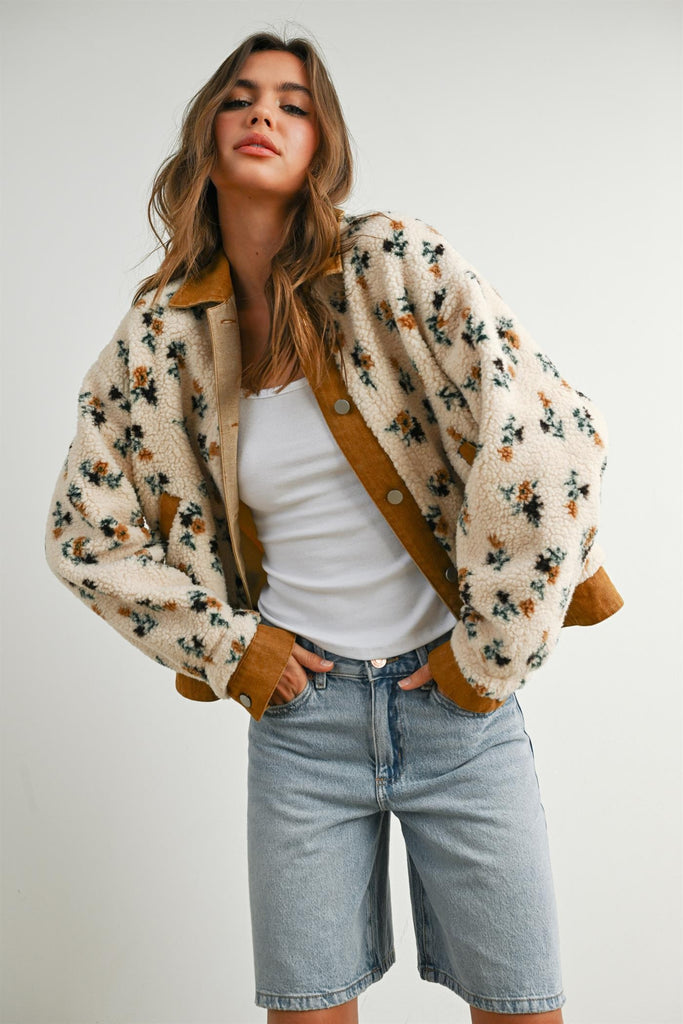 Sherpa Jacket // Floral Print // Collared Neckline // Button-Down Front // Cozy Fit // Easy Layering Piece // Seasonal Transition Piece