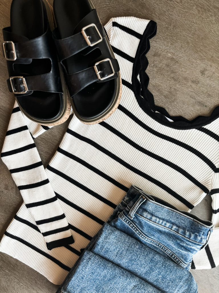 Fit Guide: Meet your next closet staple that you’ll wear on repeat! This black and white scalloped stripe long sleeve is supportive, stylish, and cute. The fitted design hugs in all the right places, while stretchy, ribbed fabric keeps it comfortable all day. Perfect for layering or wearing alone—pair with jeans, skirts, or under jackets for endless outfit options!!