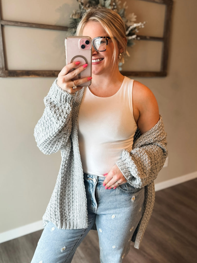 Fit Guide: One of those throw-on-and-go layers you’ll live in 🫶 This chunky cardigan fits true to size with a relaxed, cozy feel that’s perfect for everyday wear. The soft knit fabric drapes nicely without feeling bulky, and the open front design makes layering effortless. Front pockets add both function and extra comfort, making this an easy grab for running errands, lounging, or dressing up a casual outfit. A must-have neutral you’ll reach for all season long.