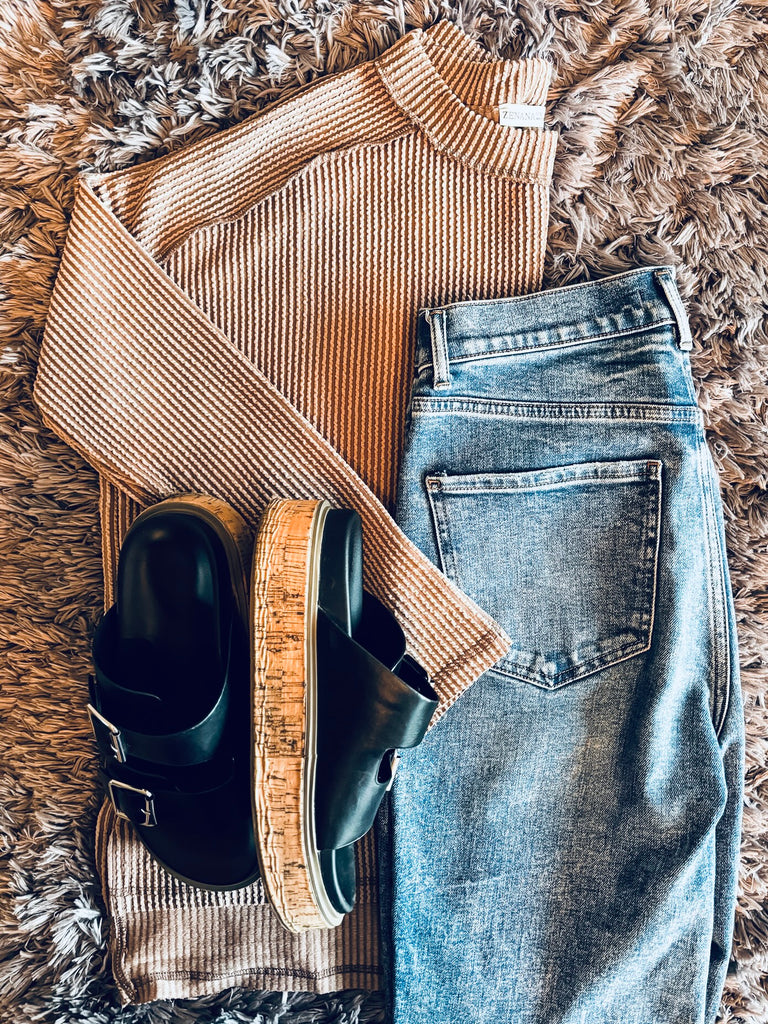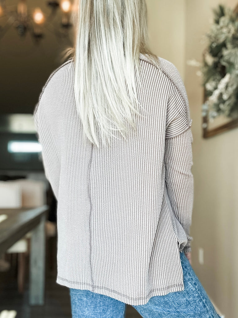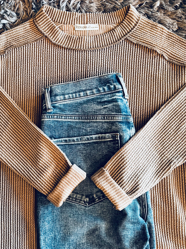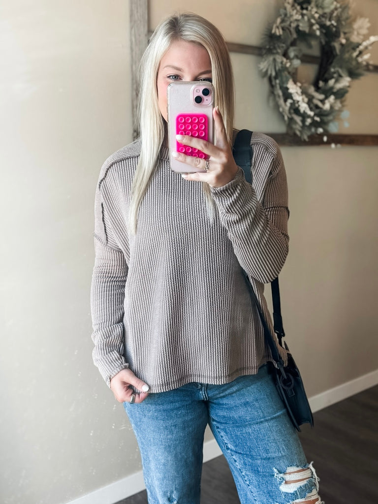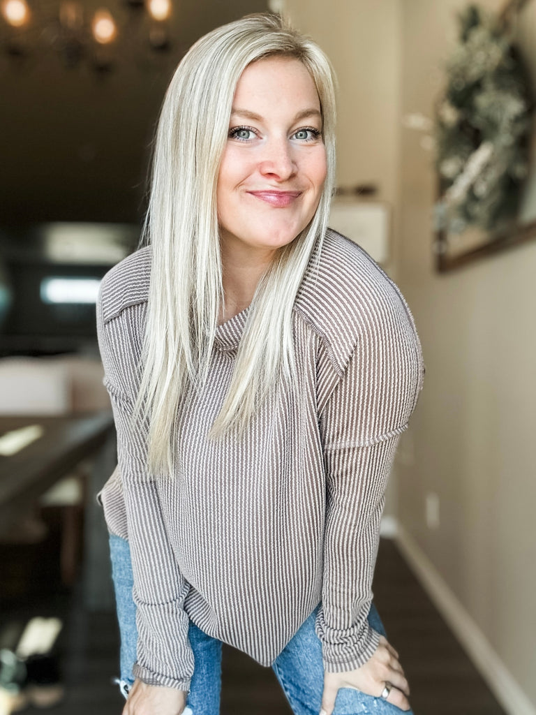 Wander & Rest Cable Ribbed Knit Drop Shoulder Top - Mocha - SIZE L/XL